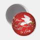 Personalisieren Sie dieses inspirierende "One a Kind" White Christmas Dove Magnet! Es besitzt eine serene weiße Weihnachtstaube, die einen Olivenzweig auf einem roten Weihnachtsgebirge zwischen Schneeflocken trägt, mit dem sich die blühenden Grauen und Silbernen Ribbons verbreiten..."Weltfrieden"! Dies ist ein Original Art Design von Künstler Kerry Miller.