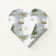 Zarte Gold- und Silberbaumdekorationen, umgeben von salzgrünen, festlichen Blättern mit frisch gefallenem Schnee in einem Winterwunderland.