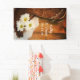 Das charmante White Daisies und Cowboy Boots Country Wedding Banner kann mit dem Hochzeitsauto der Neuvermählten verbunden werden oder als Zeichen benutzt werden, um Ihre Gäste zu Ihrer lässigen und dennoch eleganten Ranch Thema Heirat oder Empfang zu empfangen und zu leiten. Dieses dezente und elegante, rustikale Hochzeitsbanner zeigt ein malerisches, digital erweitertes Blumenfoto eines braunen Cowboystiefels aus dem Western, ein Bouquet mit blühenden weißen Blume und einen weißen Brautschleier mit braunem, verwittertem Braunholzhintergrund.