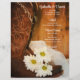 Das bezaubernde White Daisies and Cowboy Boots Country Wedding Menu mit den Details der Mahlzeit, die Sie in Ihrem informellen und eleganten Ranch Stil Hochzeitsbrunch, Brautparty oder Heirat Zeremonie, indem Sie den Salat oder ersten Gang, Vorspeise oder zweiten Gang und Dessert oder dritten Gang. Personalisieren Sie es mit den Namen der Braut und des Bräutigams, dem Ort des Empfangs und dem Datum der Ehe. Dieses Hochzeitsmenü im Ranch-Thema zeigt ein digital erweitertes Blumenfoto mit braunen Western-Cowboystiefeln aus Leder, blühenden Blume aus weißem Leder und einem weißen Brautschleier mit verwittertem Stallholzhintergrund.