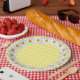 Weißer Sommergrand auf weißem und gelbem Gingham Hintergrund. Der Hintergrund kann geändert werden.