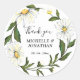 Vielen Dank Hochzeitsaufkleber zeigt einen einfachen Blumenkranz mit weißen Gänseblüten und Grünpflanzen. Es enthält die Namen und das Datum der Paare.