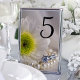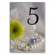 Diese eleganten White Daisy und Diamond Ring Wedding Tischnummern werden eine Touch von Klasse zu den Tischen in Ihrem Heirat Empfang, Garten Party Brautparty oder Verlobung Party hinzufügen. Diese hübschen, individuell geblümten Tischnummern sind mit einem Blumenfoto mit weißer Blume, einem runden Ring aus Diamant und weißer Perlenhalskette versehen.
