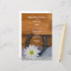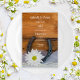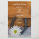 Das bezaubernde "White Daisy" und "Horseshoe Country Western Wedding Menu" mit den Details der Mahlzeit, die Sie auf Ihrem Bauernhof oder Ranch-Stil Brautparty Mittagessen, Post Hochzeitsbrunch oder Ehe Empfang-Dinner durch Hinzufügen des Salats oder der ersten Gang, Vorspeise oder zweite Gang und Dessert oder dritten Gang. Dieses rustikale, schicke und auf das Thema "Hochzeit" spezialisierte Menü bietet ein malerisches Blumenfoto mit einer weißen Blüte aus dunkler Blume, rostigem Hufeisen, Perlenhalskette, weißem Brautschleier und braunem, verwittertem Stallholz.