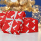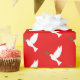 Farbige, rote Geschenkpackung gemustert mit weißen Tauben, die den symbolischen Olivenzweig tragen.