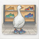 A duck stands in a shoe store, wearing bright pink and blue sneakers while gazing at a display of colorful sneakers