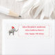 Das Design zeigt das Bild eines weißen Elefanten mit einer Weihnachtsmannmütze und stehend neben der Rücksendeadresse, die in roter Schrift ist. Im Hintergrund sind rote und grüne Fußklecksen zu sehen. Konzipiert, um sich mit der "White Elephant Christmas Party Theme Collection" abzustimmen.