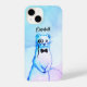 Personalisiertes iPhone Gehäuse aus weißem Stab mit Aquarellbild eines witzigen, weißen Frettchen-Gentleman, der eine Bogen-Krawatte und einen monokle und anpassbaren Namen hat. Dieses niedliche Freret Design hat eine fröhliche hellblaue, anpassbare Hintergrundfarbe.