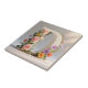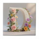 This design is special because it features a glossy, cracked white letter D adorned with dew drops and immersed in a lush, sunlit garden setting. It is richly decorated with a vibrant array of soft pink roses, orange flowers, and bright yellow blooms intertwined with green ferns and climbing vines. The composition is whimsical and rustic, making it perfect for a nursery, wedding, or nature-themed decor.
