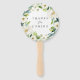 Weißer Blumenhandfan (nicht zusammengesetzt) mit einem Kranz aus weißer, wasserfarbener Blume mit grünem Blattwerk. Für eine weiter gehende Anpassung dieses Designs klicken Sie bitte auf den Button "Anpassen". Matching-Elemente sind ebenfalls verfügbar. ***Kaufe die Fächer für einen Aufpreis schon zusammengebaut***