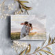 Foto Goldfolie Hochzeitseinladung personalisiert mit einem Foto und Ihre zwanglose Hochzeitsabfassung in Goldfolie gegen weiße Aquarellsträuße.