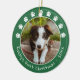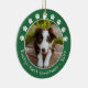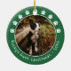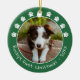 Doppel-Weihnachtsschmuck zum ersten Weihnachtsfest mit Ihrem neuen Haustier! Fügen Sie auf jeder Seite ein Foto in einem grünen Rahmen hinzu, der mit winzigen weißen Pfotendrucken, dem Namen Ihres Tieres und dem Jahr verziert ist.