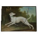 Dieses Design zeigt ein Gemälde des französischen Künstlers Jean-Baptiste Oudry (1686-1755). Es zeigt einen lila, weißen Windhund, der durch eine ländliche Landschaft sprang. Der Körper des Hundes ist schlank, aber muskulös und stark. Der Windhund trägt einen blauen Kragen um den Hals. Sein Schwanz ist beim Laufen und Sprüngen in der Luft aufgerollt. Der Kopf des Hundes ist umgedreht und sieht nach hinten, als würde er gejagt. Im Hintergrund stehen viele Bäume mit grünen Blätter.