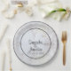 Machen Sie Ihren Empfang umso schöner mit diesen maßgeschneiderten Hochzeitspapier-Tellern. Sie sind für die Abstimmung mit unserer Hochzeitssuite White Reflections konzipiert und verfügen über einen schwarzen Rahmen mit schwarzem Text auf einem Hintergrund, der weiße Blume und Herzen reflektiert. Der Text enthält die Namen des Paares und das Hochzeitsdatum.