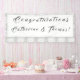 Das Design zeichnet sich durch einen weißen Imitat-Satin-Hintergrund aus und schafft ein elegantes Aussehen. Ein weißes Rechteck mit einem silberfarbenen Rahmen dient als Hintergrund für das Wort "Glückwunsch". Die Namen von Braut und Bräutigam werden unten angezeigt. Der gesamte Text ist in einem eleganten silbernen Schriftart. Konzipiert für die Koordination mit der katholischen Imitate-Satin Wedding Suite.