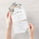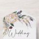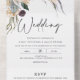 White King Protea All in One Wedding Invitation Elegant und modern mit einem böhmischen Gefühl weißen Königs Protea Hochzeit Einladung. Dieses Design umfasst einige Blumenarrangements aus weißer Protea mit grünem Blattwerk und lila Beeren. Ideal für ein Paar, das eine moderne, weiße Königsprotea Hochzeitseinladung sucht.