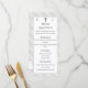 Das Design zeigt den weißen Rand als Hintergrund für Ihre individuell anpassbaren Menüoptionen. Monogramm der ersten Initialen von Braut und Bräutigam werden oben auf jeder Seite eines silbernen Kreuzes angezeigt. Text wird auf weißer Seite angezeigt, Rückseite zeigt den ersten Vornamen des Paares in einem großen, weißen Schriftart an. Die Namen des Ehepaares und des Hochzeitstages werden unten angezeigt. Sehr elegant. Konzipiert zur Koordination mit der Mit Monogramm Hochzeitssuite-Kollektion von White Lace.