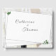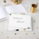White Lace und Rose Blätter Das Gästebuchdesign von Wedding präsentiert die Vornamen von Braut und Bräutigam auf der Vorderseite in dekorativer, silberner Schrift. Hintergrund zeigt das Bild von weißer Spitze. Die Blätter der grünen Rose sind an den Ecken zart positioniert. Umgekehrt zeigt das Hintergrundbild einer Braut und Bräutigam, umgeben von dem Bild der weißen Spitze.