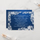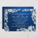 Weiße, blumengeschmückte Spitzen über einem dunkelsaphir blauen Hintergrund personalisieren die Hochzeitseinladung wie gewünscht.