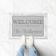 Diese elegante, dekorative und stilvolle, individuelle Türmatte ist mit einem weißen Marmorboden und zwei rechteckigen, grauen Rahmen ausgestattet. Der Gruß "WELCOME" wird im oberen Teil des Teppichs gedruckt, gefolgt von einer dekorativen Akzent-Linie.