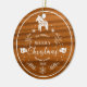 White Christmas circle ornament with Christmas pony, peace birds, snowflakes, and botanical branches on a mahogany wood texture.