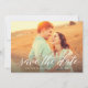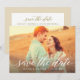 Mit diesen schicken Ankündigung Datum freihalten-Karten, die Ihr Verlobung-Foto mit einem modernen Kalligraphie-Skript-Overlay-Design kennzeichnen, verkünden Sie Ihre Hochzeit stilvoll. Diese zweiseitige Karte enthält einen Text auf der Vorder- und Rückseite, der mit allen wichtigen Details, einschließlich einer Hochzeitswebsite, personalisiert werden kann. Beachten Sie, dass der Filter für dunkle Foto auf der Vorderseite für den Kontrast zum Text vorhanden ist, aber er kann entfernt werden. Auf der Rückseite der Karte befindet sich ein goldfarbener antiker Text mit neutraler Beige Randfarbe. Diese beige Hintergrundfarbe kann geändert werden.
