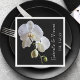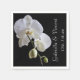 Das hübsche White Orchid auf Black Wedding Paper Napkins wird Ihrem Brautparty oder Empfang einen eleganten Flair hinzufügen. Diese eleganten botanischen Einzel-Servietten verfügen über ein Blumenfoto mit weißen Phalaenopsis-Orchideen-Blume-Blüten auf dem Stamm mit schwarzem Hintergrund.