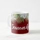 Die Tasse ist wunderschön und bietet eine wunderschöne Gartenanlage mit weißer Poinsettias und anderen saisonalen Blättern auf Cranberry-Rot-Hintergrund mit weißem, individualisierbarem Text.
