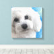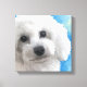Hundekunst für Poodle-Liebhaber, weißes Poodle-Portrait auf gestreckter Leinwand. Die Kunst umschließt die Leinwand, sodass kein Rahmen nötig ist.