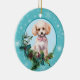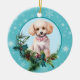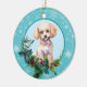 An der Vorderseite dieses Holiday-Ornament ist ein wunderschönes Porträt eines weißen Poodle-Hundes gerahmt in einem heiligen und immergrünen Teig. Rote Beeren und Kiefernkonen schmücken die heiligen und kiefernroten Früchte. Das Bild wird auf einem blass blauen Kreis gerahmt durch ein Retro-blaues Schneeflockenmuster platziert. Die Rückseite des Ornaments hat den gleichen Hintergrund und Kreis mit Ihrem benutzerdefinierten Text in blau.