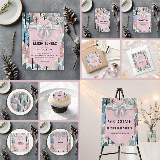 White Ribbon Winter Forest Snowflakes Babydusche Einladung