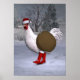 väterliche Weihnachten got ein niedliches Huhn als Helfer in diesem Jahr - fröhlich mit roten Stiefeln marschieren und im Winter durch den Schnee.