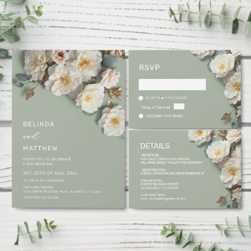 White Roses 3D Flowers Elegant White Wedding Einladung