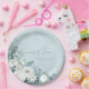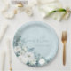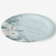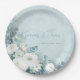 White Roses Hellebores Silver Eucalyptus floral wedding paper plate featuring elegant calligraphy script modern watercolor flowers frosty pale blue background and snowflake details