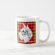 Scottish Terrier Tasse mit White Scottie auf einem karierten Hintergrund in Rot und Schwarz.