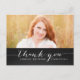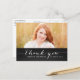 Trendy White Script Rustic Abschluss Danke Karte. Design von Elke Clarke © Besuchen Sie unseren Shop www.zazzle.com/monogramgallery* für weitere Farben und Stile. Fügen Sie Ihr eigenes Foto und Text hinzu. Ein einfaches, handgeschriebenes Skript-Schriftart-Textüberlagern auf einem schwarzen Chalkboard-Hintergrund (Printeffekt des Fotos) mit den Worten "Danke". Ersetzen Sie das Beispiel-Foto durch das eigene.