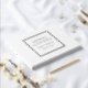 Weißes, einfaches Gästebuch mit stilisierten Foliendrucken innerhalb eines quadratischen Rahmens, der den Namen der Braut und des Bräutigams sowie das Hochzeitstermin in Ihrer Auswahl an Farbfolienprint zeigt. Hier in Silberfolie gedruckt. Wählen Sie Ihren Gastbuchstil aus.