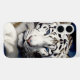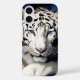 Ein auffallender weißer Tiger mit blauen Augen, die direkt auf einen schauen, vor einem dunklen und traurigen Hintergrund. Ein kühnes und faszinierendes Bild, das sich perfekt für Tierliebhaber eignet.