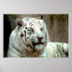 Ein weißer Tiger, der selbst abgeschieden ist, mit Felshintergrund, der einen anschaut