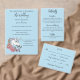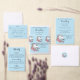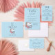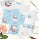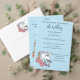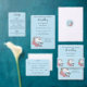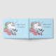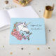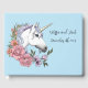 Ein weißes Einhorn im Profil ist umgeben von rosa, korallenfarbenen und lavendelfarbenen Blume, die einen zarten blauen Hintergrund bilden.