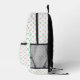 Two images of a backpack. Front: White with a colorful, geometric pattern, black zipper and pocket. Back: Solid black with adjustable straps. Casual and modern design.