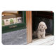 nicht sicher, ob es sich wirklich um eine Poodle oder eine andere Rasse, aber es ist sehr niedlich - sitzen an der Tür eines antiken Buchhandlung in Wien, Österreich