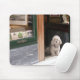 nicht sicher, ob es sich wirklich um eine Poodle oder eine andere Rasse, aber es ist sehr niedlich - sitzen an der Tür eines antiken Buchhandlung in Wien, Österreich