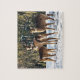 Drei weiße Schwänze stehen vor immergrünen Bäumen.
