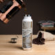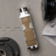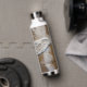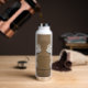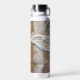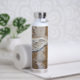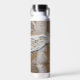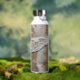 Wasserflasche mit einem doppelten Bild des Ozeans, weißliche Wäsche auf einem Sandstrand.