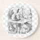 Runder Sandstein-Untersetzer mit einem Vintagen Alice im Wunderlandbild von Alice und von Raupe, die auf einem Pilz sitzt, der sein Hookahrohr raucht, während Alice auf ihren Tiptoes steht, um ihn zu sehen. Grauer und weißer Schachbrethintergrund. See Untersetzer- und Papiercocktailserviette zusammenpassenden Papiers. Sehen Sie die gesamte Märchenland-Untersetzersammlung im FOOD/BEV | Untersetzerabschnitt.