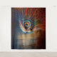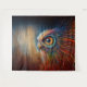 Eine sehr detaillierte und farbenfrohe künstlerische Darstellung des Kopfes einer Eule vor einem Hintergrund aus vertikalen Holzplanken. Die Eule weist komplexe Muster und lebhafte Farben auf und verleiht ihr ein strukturiertes, fast mechanisches Aussehen. Das große, tiefblaue Auge hebt sich durch die orangen, gelben, blauen und grauen Farbtöne hervor