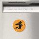 Eine schwarze böse Hexe, die vor dem orangen Halloween-Mond auf ihrem Besen fliegt.