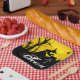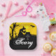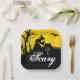 Eine böse Hexe und ihr Kessel, eine schwarze Fledermaus, ein Heftzaun und eine nackte Baumseide, die an einem unscharfen Himmel befestigt sind, in diesen Tellern aus Halloween-Party-Vierkantpapier stehen die Worte "Essen, Trink & Sei Beängstigend". PASSENDE Artikel in unserem Geschäft.