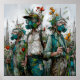 Ein dreistufiges Öko-AktivistInnen, maskiert und entschlossen, stehen unter einer Blüte aus Wildblumen und Stahl. Diese dreckige Abbildung zeigt den dringenden Geist der Regeneration und Rebellion in einer zerbrechlichen Welt.